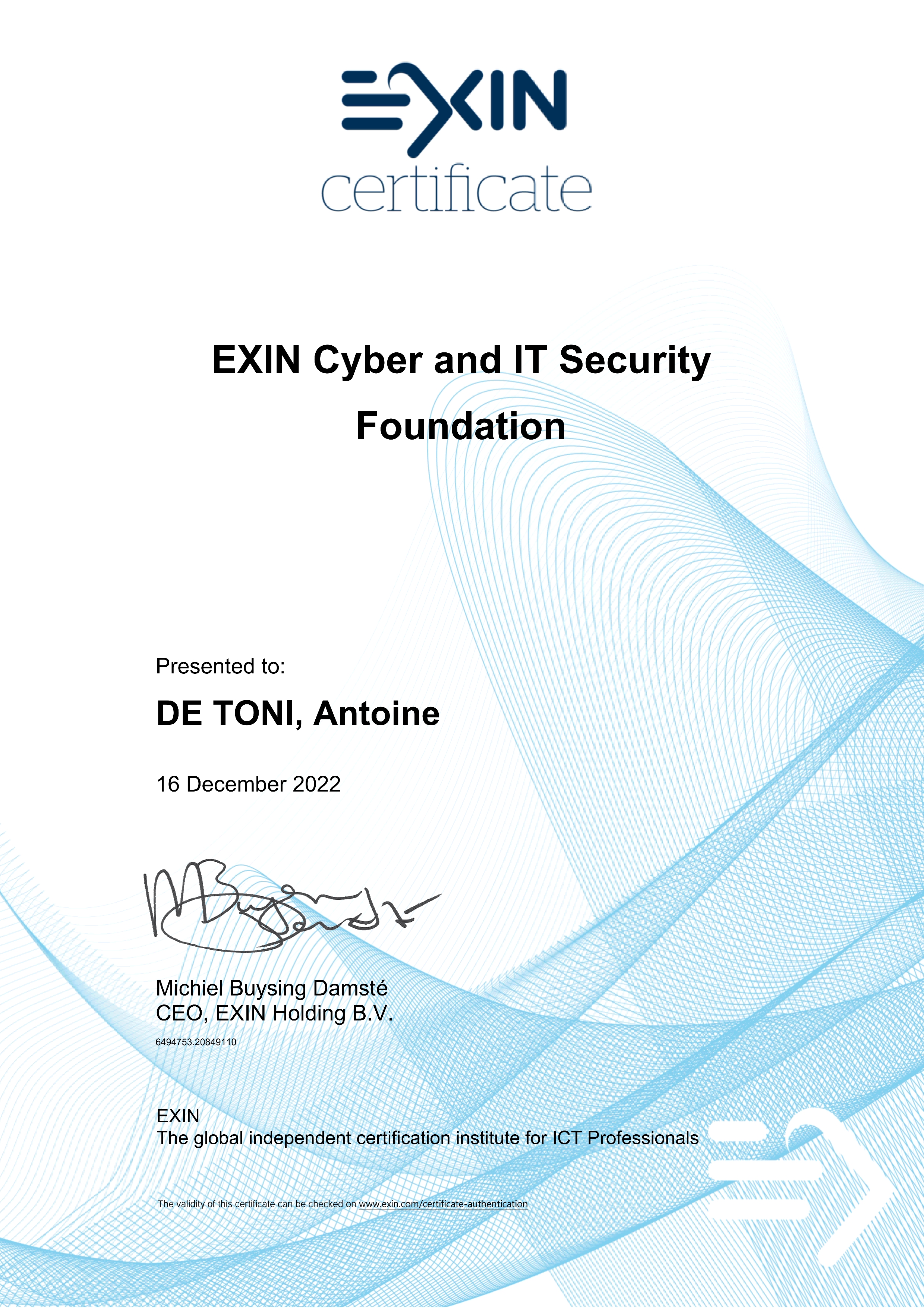 ANTOINEDE TONIRESPONSABLE D’EQUIPETECHNIQUE ITEXPERIENCES PROFESSIONNELLESVCI INFORMATIQUE | RESP. D’EQUIPE TECH. Nov. 2019 – Aujourd’hui • Supervision de l’équipe, gestion des plannings • Suivi des projets en lien avec le chef de projets • Gestion globale des incidents techniques & tickets VCI INFORMATIQUE | TECH. RESEAU & SYSTEME Avril. 2012 - Nov. 2019 • Traitement des incidents techniques et des tickets • Prise d’appels - Support téléphonique - Télémaintenances • Interventions / Installations sur site client CERTIFICATIONS TECHNIQUESEXIN - Cyber and IT Security Foundation Décembre. 2022